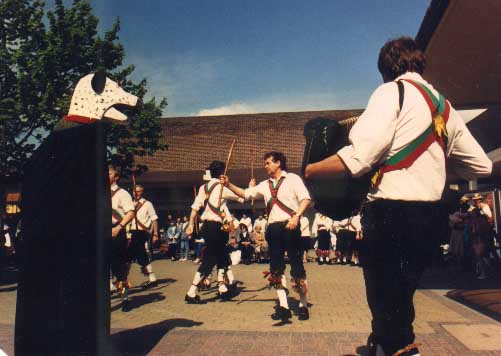Colchester Morris Men's animal is a dog, perhaps a bit dalmatian (though more intelligent) but certainly Spotted. He is perhaps a trifle square-jawed for a Dog (haling from a decidedly pre-fibre-glass era, this is a reflection of his plywood and timber construction), but a dog he was made, and a dog he will stay. He answers to the name Wilbur, and was created by Ewart "Rusty" Russell, sometime Bagman of Colchester, and Fool too. Rusty, as well as fathering Wilbur, fathered Bob Russell M.P., a friend of Morris now in that devilish Palace of Westminster.
